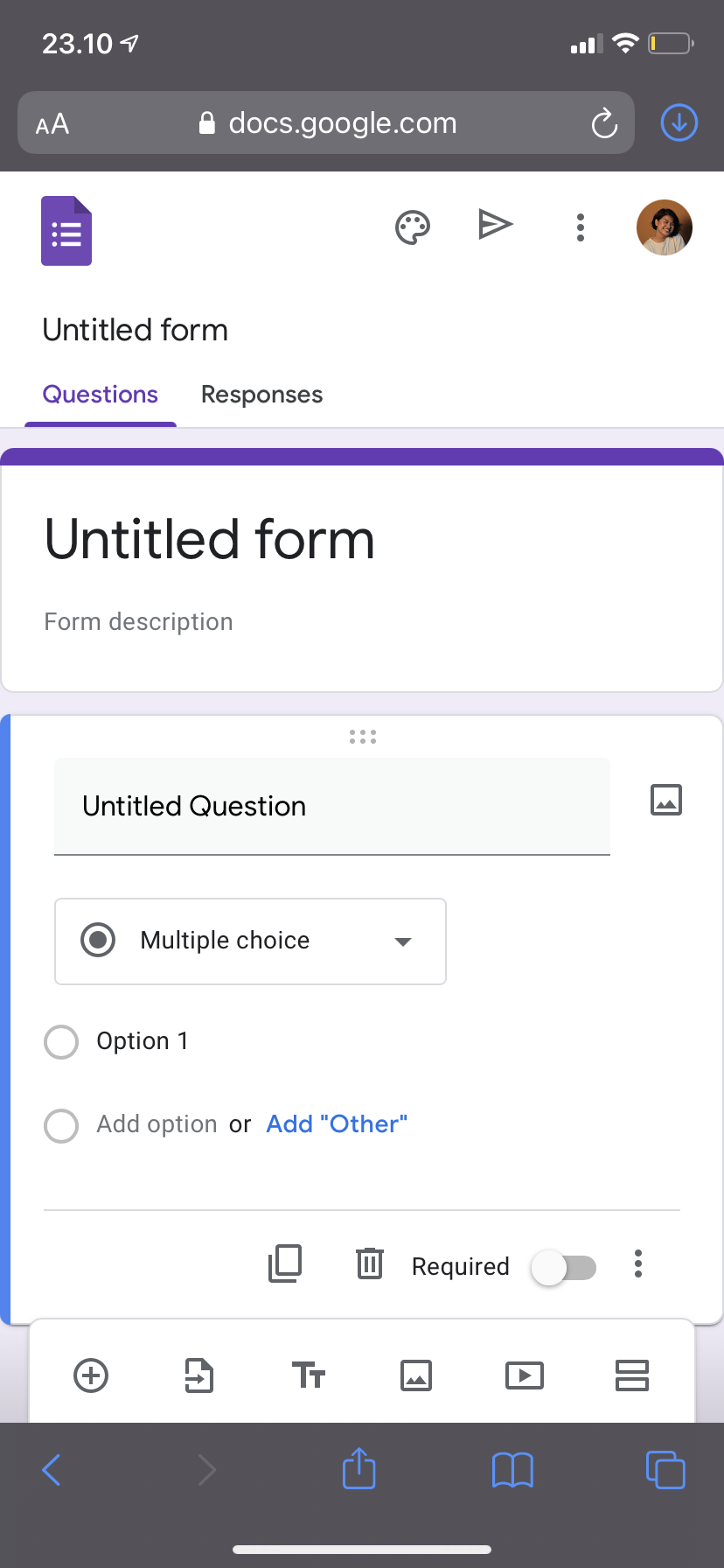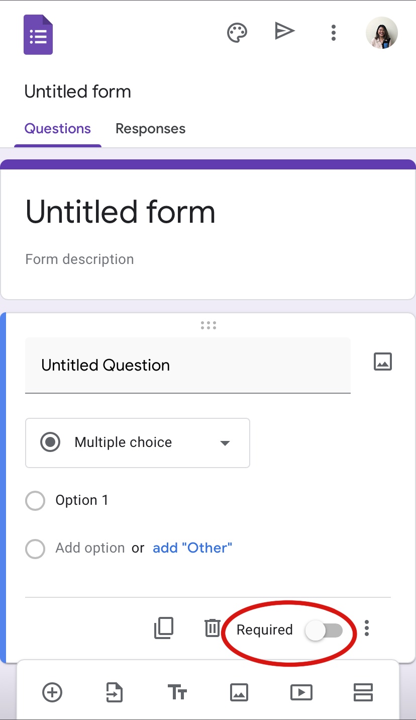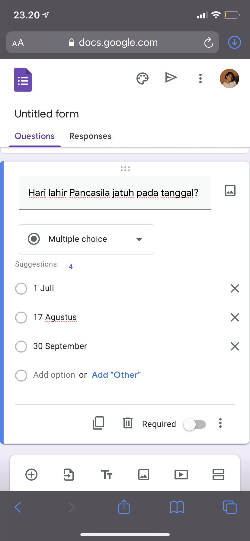 7. Selanjutnya, untuk pertanyaan atau data yang mau dikumpulkan wajib diisi, maka Bapak/Ibu bisa mengaktifkan pilihan required yang terletak di bagian bawah kanan setelah melengkapi kolom untitled question.