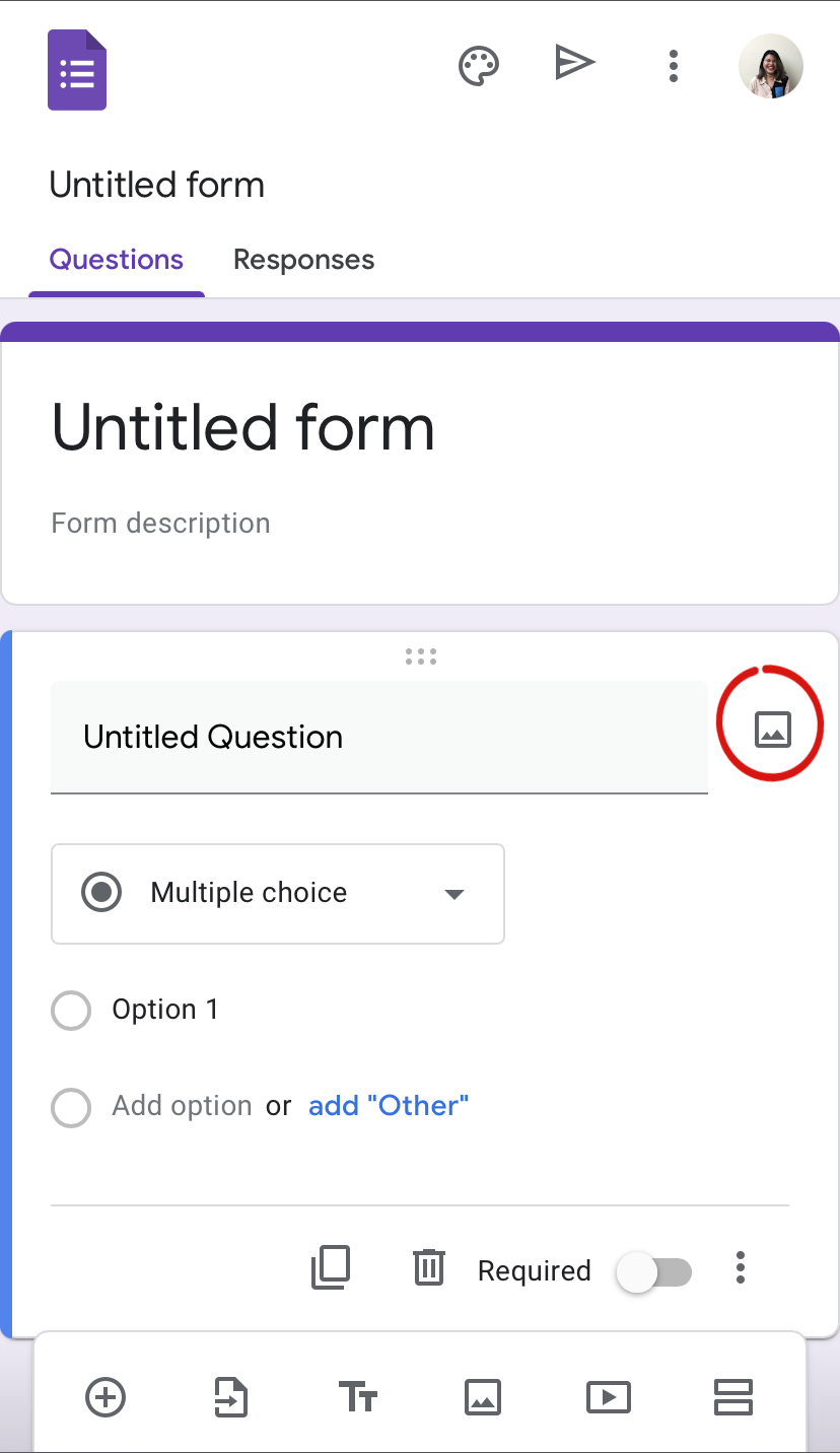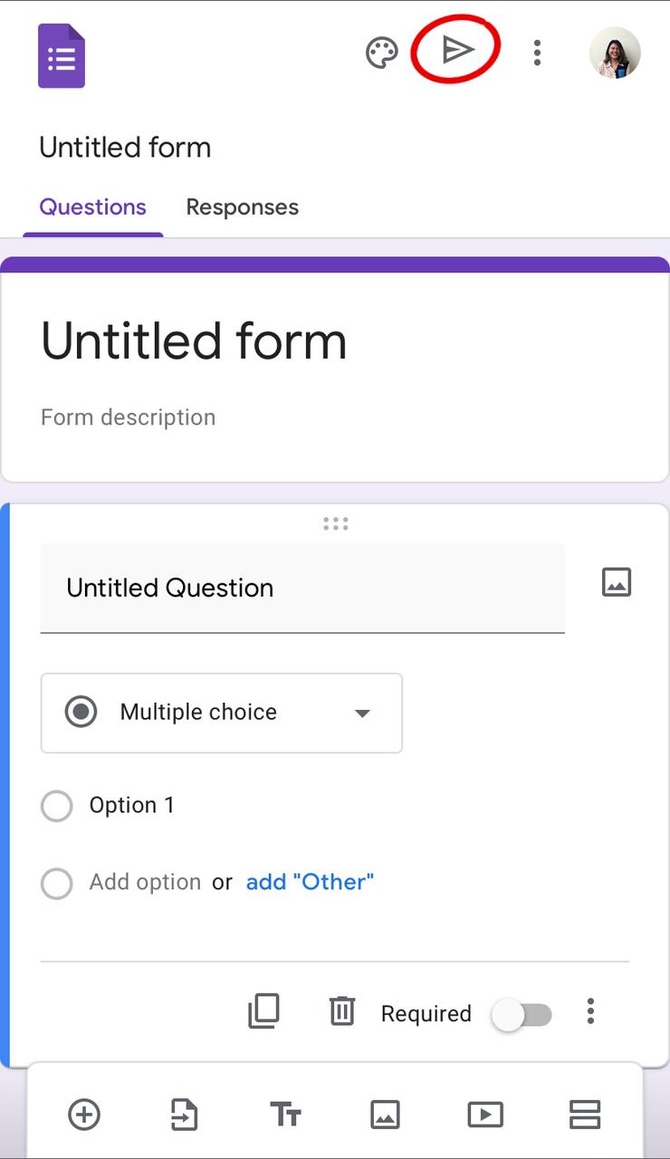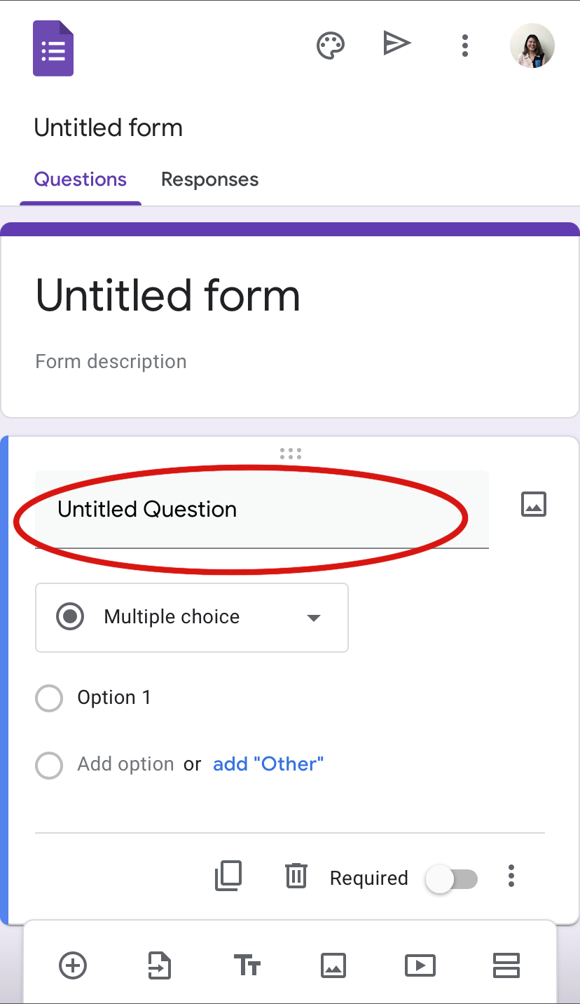 7. Selanjutnya, untuk pertanyaan atau data yang mau dikumpulkan wajib diisi, maka Bapak/Ibu bisa mengaktifkan pilihan required yang terletak di bagian bawah kanan setelah melengkapi kolom untitled question.