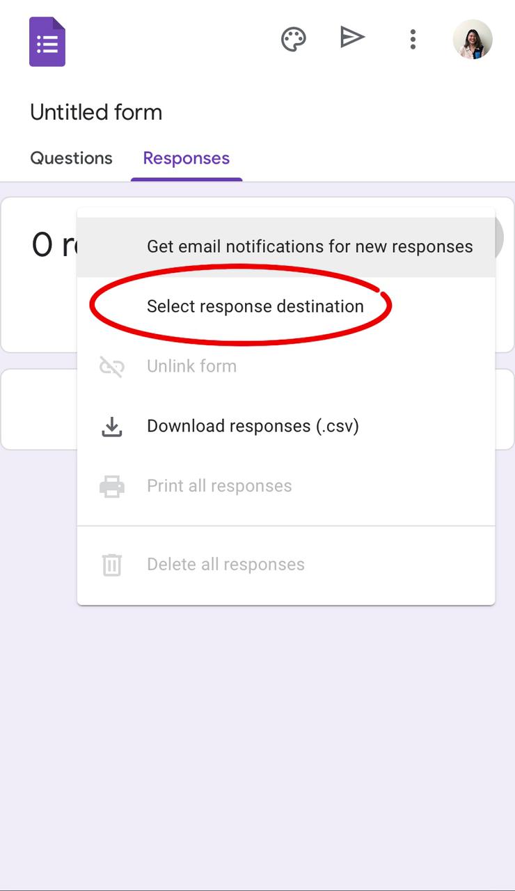 8. Pada tab responses, pilih destinasi untuk menyimpan respons dari form.