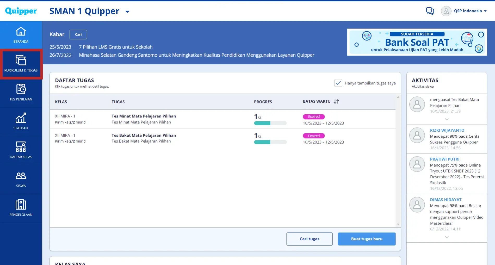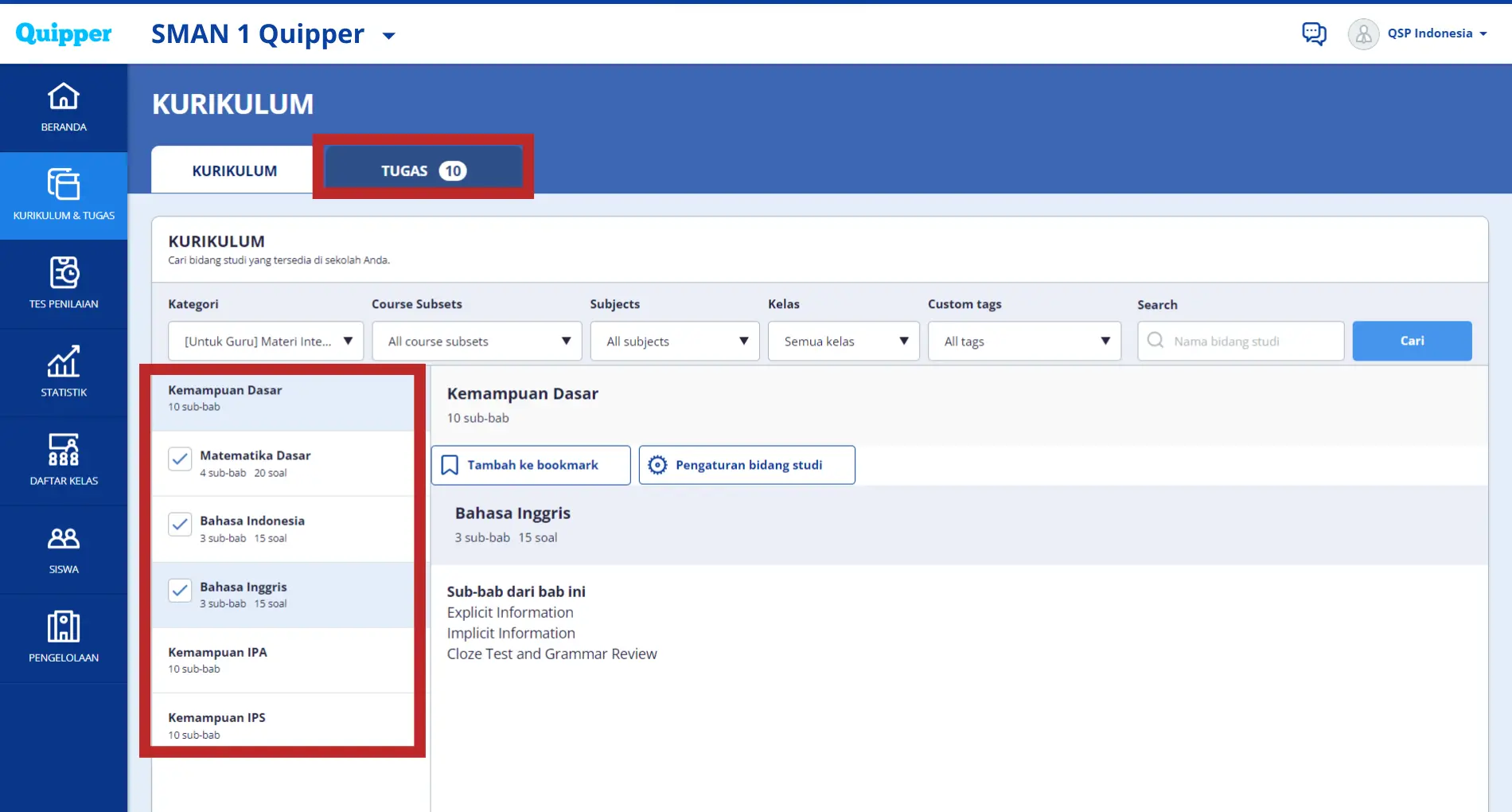 - Masuk ke akun Quipper LINK Anda melalui link.quipper.com, lalu pilih menu “Kurikulum & Tugas” yang ada pada sebelah kiri halaman