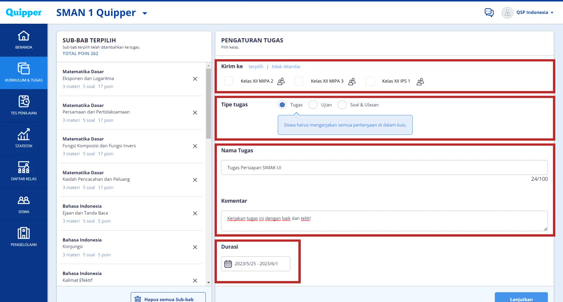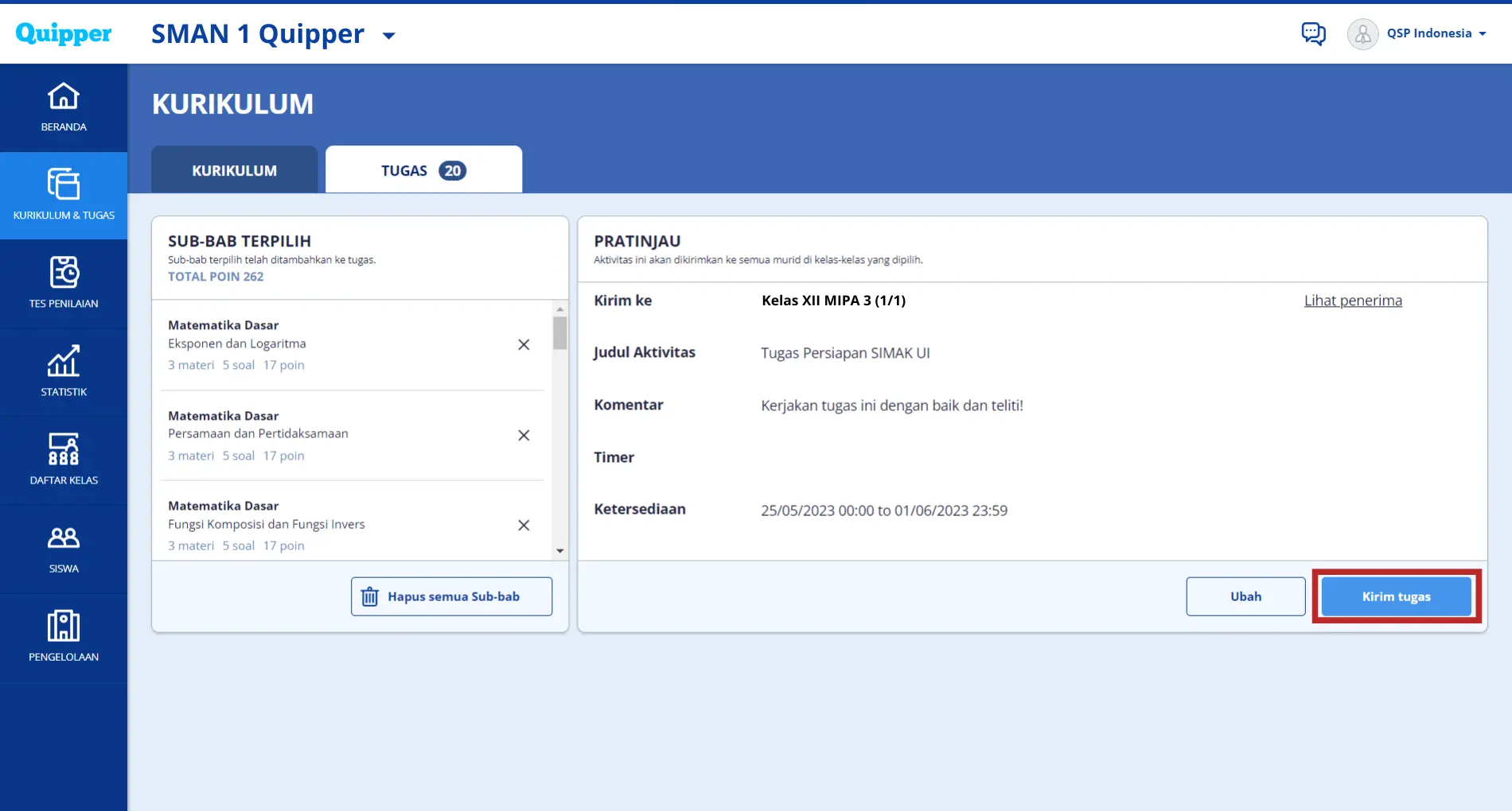 - Setelah semua pengaturan selesai, klik “Lanjutkan”. Pratinjau kembali tugas yang akan dikirimkan, lalu klik “Kirim Tugas” jika semua sudah sesuai.