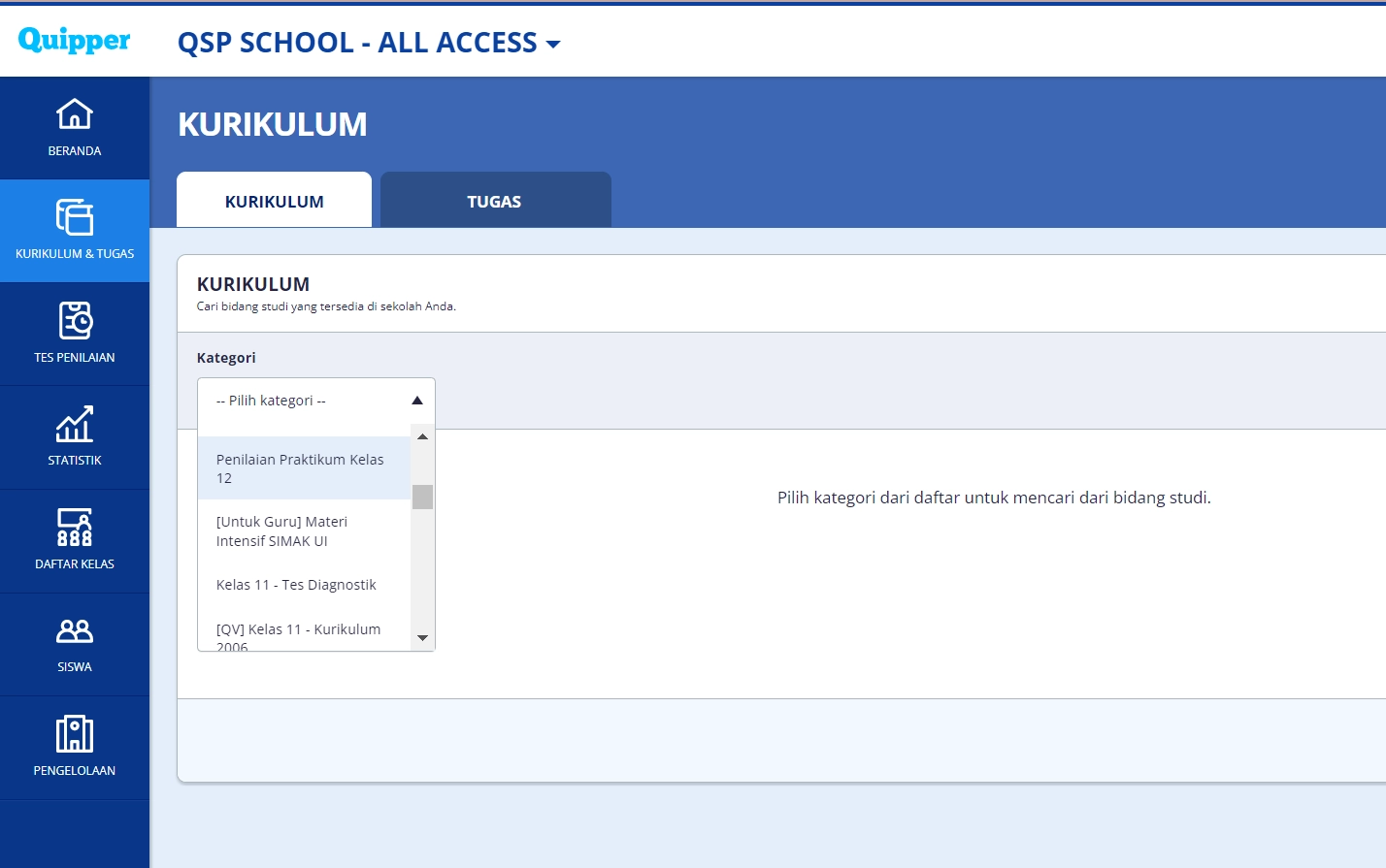 - Pilih menu “Kurikulum & Tugas”, kemudian pilih kategori “Penilaian Praktikum” (Kategori “Penilaian Praktikum” tersedia pada setiap jenjang kelas)