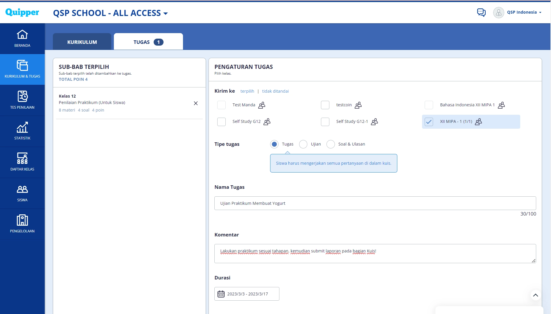 - Pilih tipe tugas sebagai: Tugas, agar siswa dapat mengakses panduan serta kuis