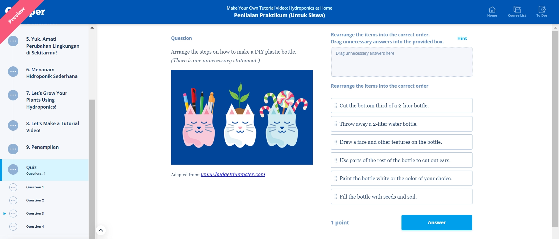 Quipper juga berupaya menyajikan materi yang komprehensif di Modul Penilaian Praktikum dengan berpedoman referensi terkini dan dilengkapi ilustrasi menarik untuk memudahkan pemahaman siswa. Materi yang tersedia bukan hanya panduan dan pelaksanaan proyek, tetapi juga sudah mencakup penilaian dan kuis.