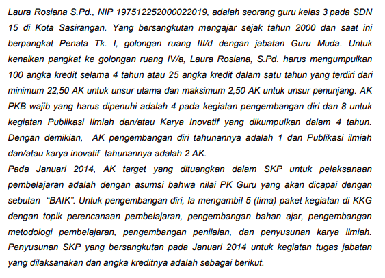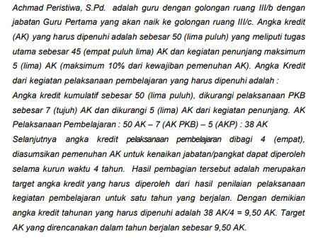 - Kegiatan kolektif guru dengan 5 paket kegiatan untuk meningkatkan kemampuan dalam membuat perangkat pembelajaran -> AK = 5 paket × 0,15 = 0,75 AK