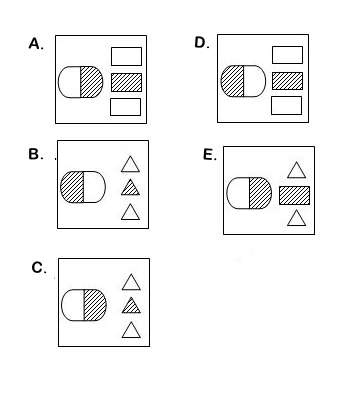 Gambar sebelah kiri petak pertama memuat gambar sebuah segitiga dan tiga persegi panjang berukuran kecil, di mana persegi panjang baris kedua diberi arsiran. Pada petak kedua, segitiga berubah menjadi persegi panjang dengan setengah bagiannya diarsir. Sementara itu, ketiga persegi panjang di petak pertama, berubah menjadi segitiga.