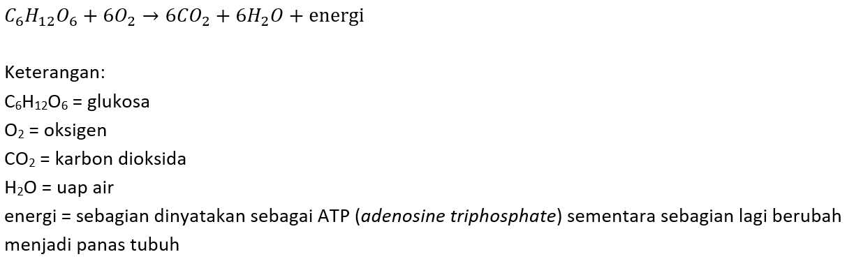 Di dalam sitoplasma inilah proses respirasi sel yang menghasilkan energi terjadi. Pada intinya, respirasi sel adalah proses pengubahan glukosa oleh oksigen menjadi energi. Jadi memang glukosa dan oksigen yang menjadi tokoh utamanya. Secara kimiawi, reaksi umum dari proses respirasi sel adalah sebagai berikut: