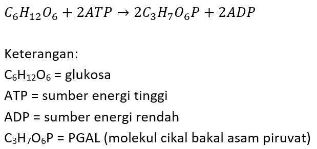 Tahapan ini disebut fase investasi karena untuk bisa menghasilkan energi, tubuh kita harus menggunakan energi. Ya, harus ada modal. Modal yang digunakan adalah 2 ATP untuk setiap molekul glukosa. Reaksinya adalah sebagai berikut: