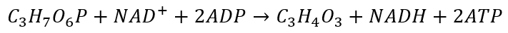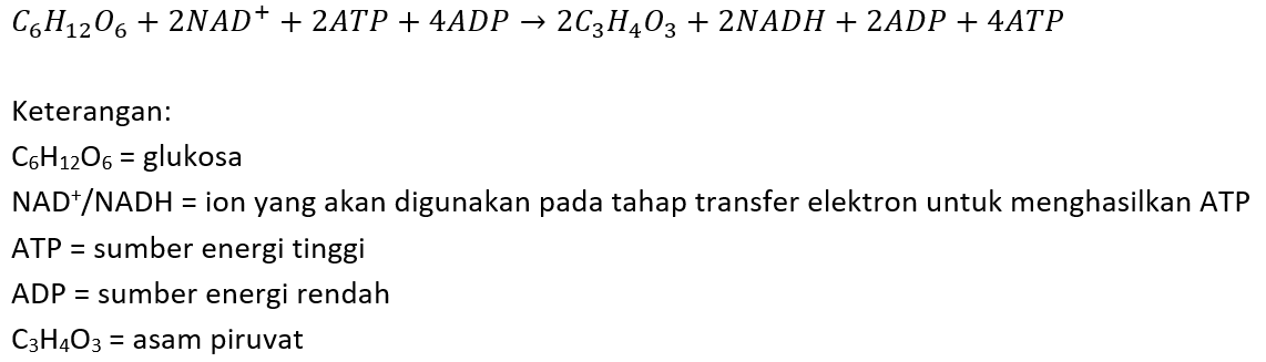 Jadi pada prinsipnya, glikolisis merupakan proses pemecahan glukosa. Pada glikolisis, satu molekul glukosa dipecah menjadi 2 molekul asam piruvat. Secara kimiawi, reaksinya adalah sebagai berikut: