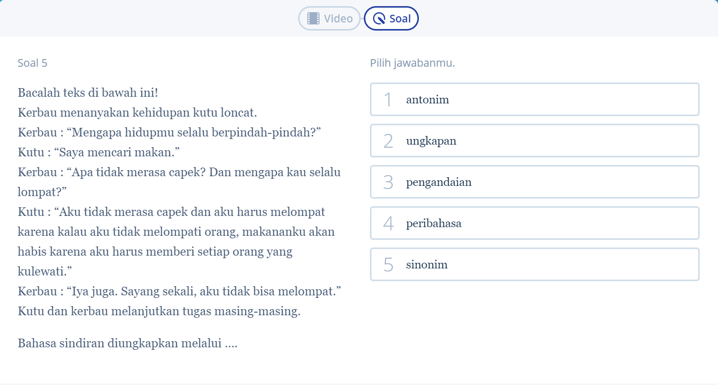 Sama seperti soal sebelumnya, pada contoh soal nomor lima juga kamu diharuskan menganalisis soalnya. Untuk itu, kamu harus mencermati bahasa soalnya. Coba cari bahasa sindiran yang ada di dalamnya.