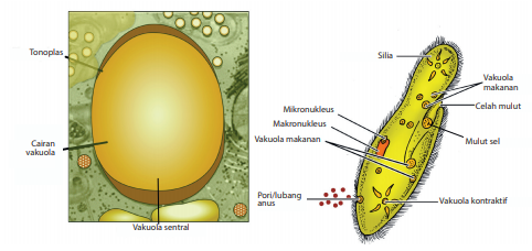 Vakuola merupakan organel yang berbentuk kantong dan berisi cairan yang diselubungi membran tunggal. Berbeda dengan lisosom, vakuola ini hanya dimiliki oleh sel tumbuhan dan hewan uniseluler tingkat rendah seperti protozoa. Vakuola berfungsi untuk menyimpan gas, senyawa organik, pigmen daun, buah, dan bunga. Berdasarkan jenis dan fungsinya, vakuola dibagi menjadi tiga, yaitu vakuola kontraktil, nonkontraktil, dan sentral. Berikut ini akan ditunjukkan gambar vakuola pada tumbuhan dan sel Paramecium.