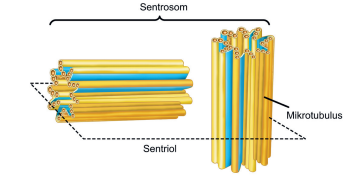 Sentriol merupakan organel yang terdiri dari tubulin dan berbentuk silinder. Organel ini memegang peranan penting dalam proses pembelahan sel. Adapun fungsi sentriol adalah menyelesaikan proses sitokinesis, mengatur spindel mitosis, dan berperan dalam penataan ruang sel. Adapun gambar sentriol adalah sebagai berikut.
