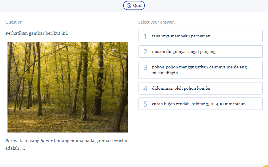Gambar pada pertanyaan ialah bioma hutan gugur dengan ciri khasnya, yaitu pohon-pohon yang menggugurkan daunnya menjelang musim dingin atau pada saat musim gugur. Hal itu merupakan cara pepohonan di dalamnya beradaptasi dalam menghadapi musim dingin yang minim air untuk proses fotosintesis.