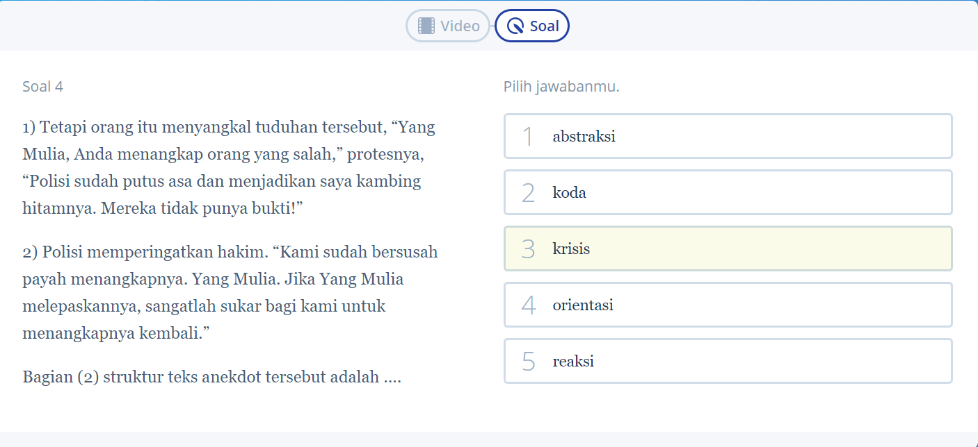 Soal tersebut pada dasarnya menyinggung perihal submateri struktur dari teks anekdot. Seperti yang sudah pernah dibahas pada artikel sebelumnya, struktur teks anekdot terdiri dari lima bagian, yakni abstraksi, orientasi, krisis, reaksi, dan koda.