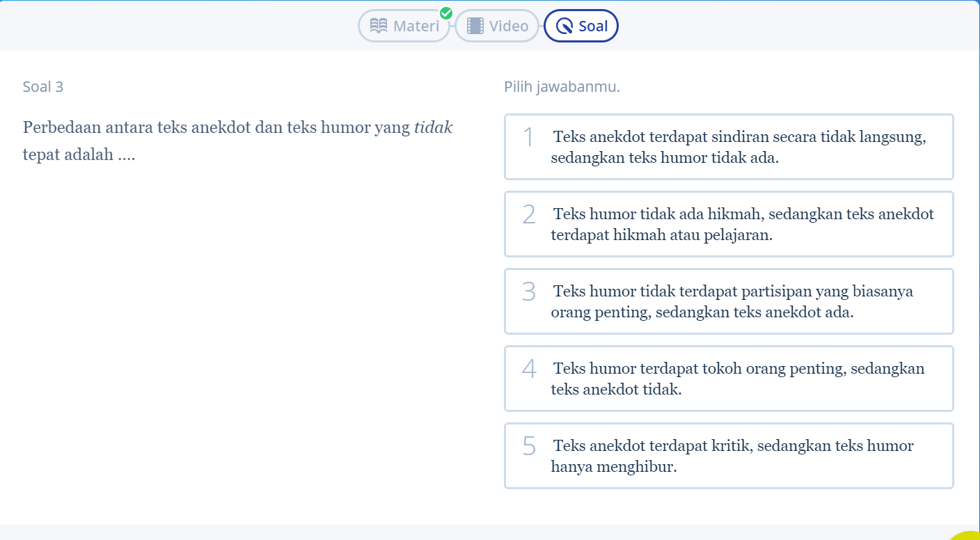 Contoh soal nomor tiga tersebut menyinggung soal perbedaan antara teks anekdot dengan teks humor. Pada dasarnya, ada beberapa hal yang amat membedakan teks anekdot dengan teks humor.