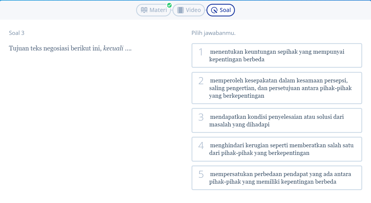 Contoh soal nomor 3 ini menukil submateri tujuan teks negosiasi. Untuk bisa menjawabnya cukup mudah, yakni kamu sudah memahami apa tujuan dari teks negosiasi.