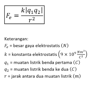 Coulomb menyatakan bahwa jika ada dua benda yang memiliki muatan listrik q1 dan q2, sejenis atau berbeda, yang terpisah pada jarak tertentu r maka besar gaya tolak atau tarik yang terjadi antara kedua muatan proporsional dengan hasil kali nilai masing-masing muatan dan berbanding terbalik dengan kuadrat jarak keduanya. Gaya tolak atau gaya tarik antarbenda bermuatan ini disebut juga gaya elektrostatis. Secara matematis, Hukum Coulomb tersebut dapat dinyatakan dengan:
