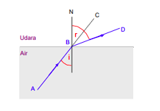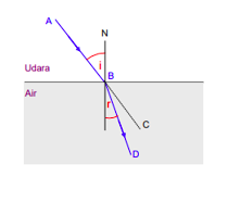 Gambar di atas menunjukkan bahwa pada kondisi normal cahaya akan merambat lurus, yaitu dari A – B – C. Oleh karena indeks bias udara lebih kecil daripada air, maka arah rambatnya akan dibelokkan menjadi A – B – D.