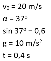 Dari suatu titik P di atas tanah, sebuah bola dilemparkan dengan kecepatan awal 20 m/s dan sudut elevasi 37o (sin 37o = 0,6). Jika diketahui percepatan gravitasi adalah 10 m/s2, berapakah kecepatan bola saat t = 0,4 detik?