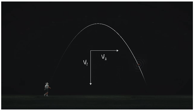 Ketika bola melayang di udara melalui lintasan berbentuk parabola, terdapat dua komponen kecepatan yang dimiliki oleh bola tersebut, yaitu kecepatan vertikal (v1) dan kecepatan horizontal (v2). Kedua komponen kecepatan tersebut dapat direpresentasikan sebagai vektor. Vektor merupakan besaran yang memiliki dua dimensi (nilai dan arah). Dalam hal ini, kecepatan merupakan vektor yang memiliki nilai kecepatan dan arah. Semakin besar kecepatannya, semakin panjang vektornya.