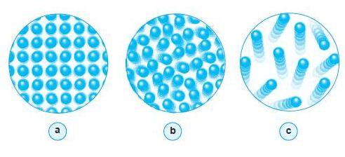 Berikut ini adalah perbandingan kepadatan molekul pada benda padat (a), cair (b), dan gas (c):