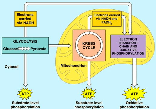 Produk dari proses ini adalah karbon dioksida dan air, tetapi energi yang ditransfer digunakan untuk memecah ikatan yang kuat di ADP sebagai kelompok fosfat ketiga ditambahkan untuk membentuk ATP, oleh fosforilasi tingkat substrat, NADH dan FADH2