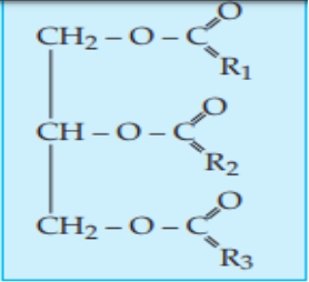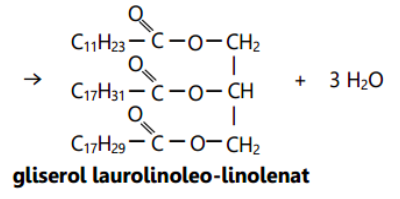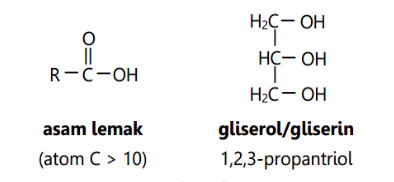 Pada gambar di atas, R1/R2/R3 yang dimaksudkan adalah rantai hidrokarbon dengan jumlah atom karbon dari 3 sampai 23. Tetapi paling umum dijumpai adalah 15 atau 17. Lemak yang terbentuk dari asam karboksilat sejenis (R1= R2=R3) disebut lemak sederhana. Jika terbentuk dari dua atau tiga jenis asam karboksilat disebut campuran. Penamaan lemak dimulai dengan kata gliseril yang diikuti nama asam lemaknya.