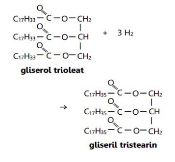 Reaksi hidrogenasi adalah reaksi penjenuhan lemak yang mengubah wujud lemak menjadi bentuk padat. Contoh reaksi kimia pada reaksi hidrogenasi adalah sebagai berikut: