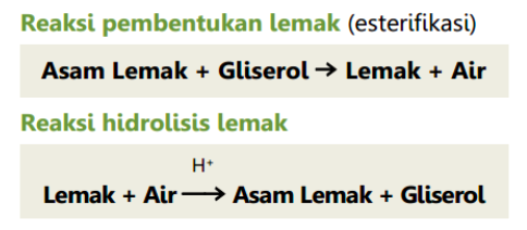 Ada tiga jenis reaksi kimia yang terjadi pada lipid yaitu Reaksi pembentukan-hidrolisis, Reaksi saponifikasi (penyabunan), dan Reaksi hidrogenasi.