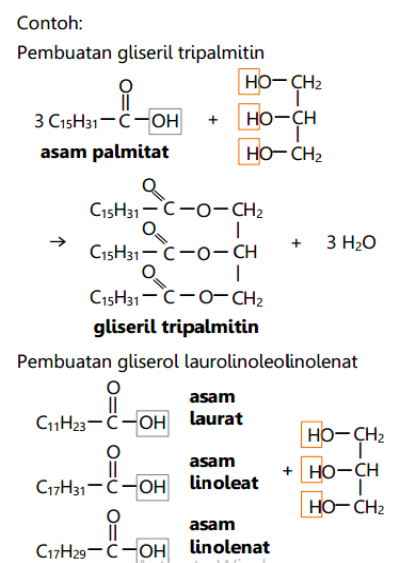 Contoh dari reaksi pembentukan lipid dan reaksi hidrolisis lipid adalah pembuatan gliseril tripalmitin dan pembuatan gliserol laurolinoleolinolenat. Gambar struktur kimianya adalah sebagai berikut: