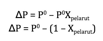 Penurunan tekanan uap larutan adalah selisih antara tekanan uap pelarut murni dengan tekanan uap larutan, sehingga demikianlah rumusnya: