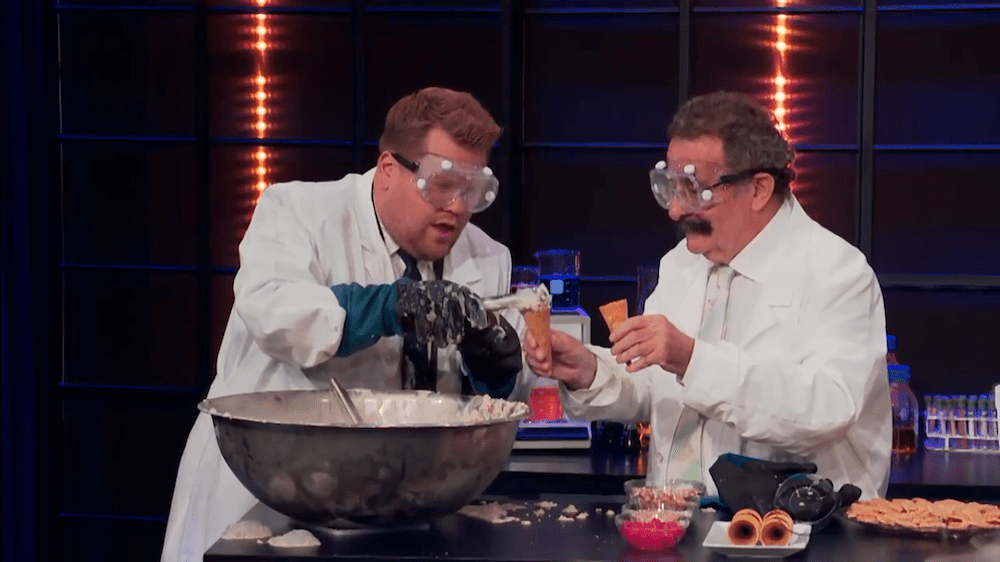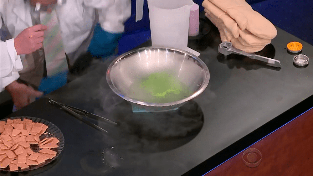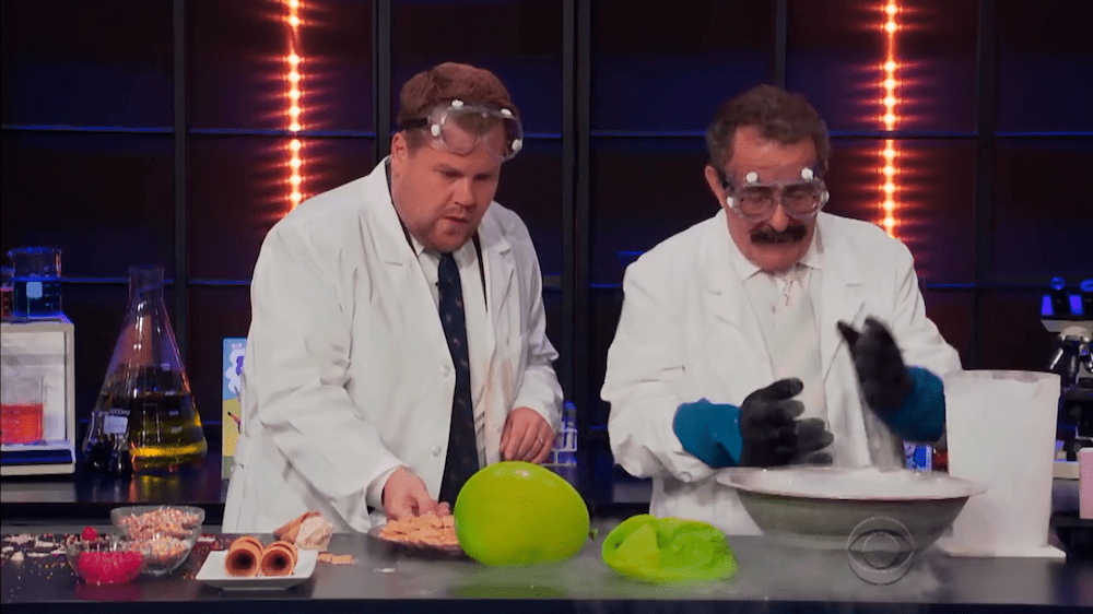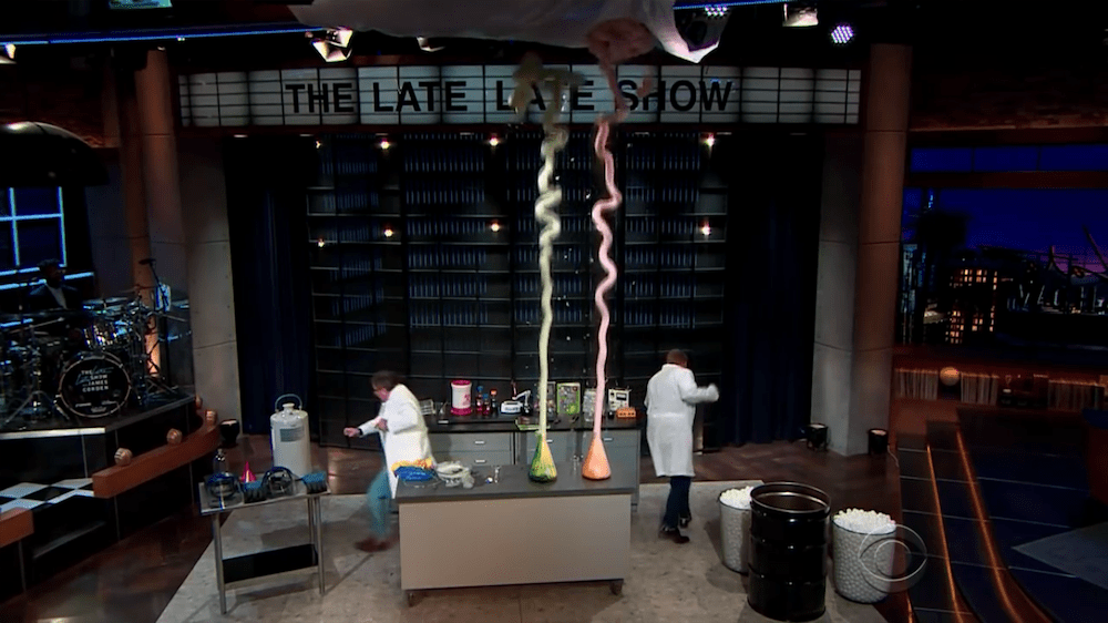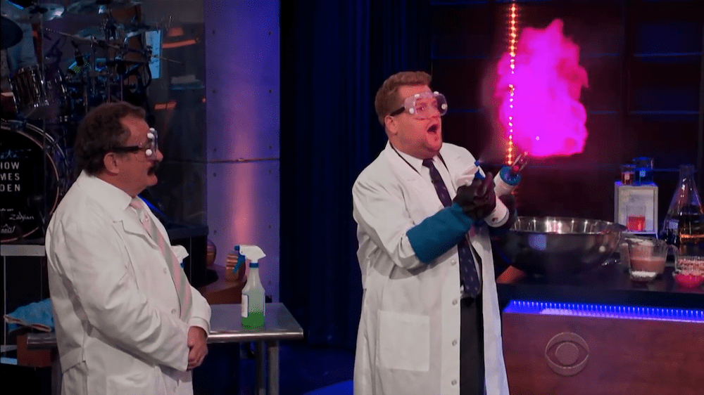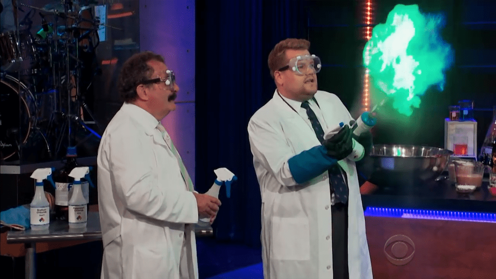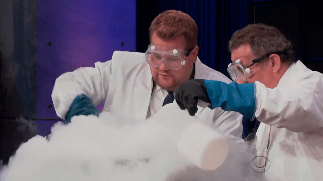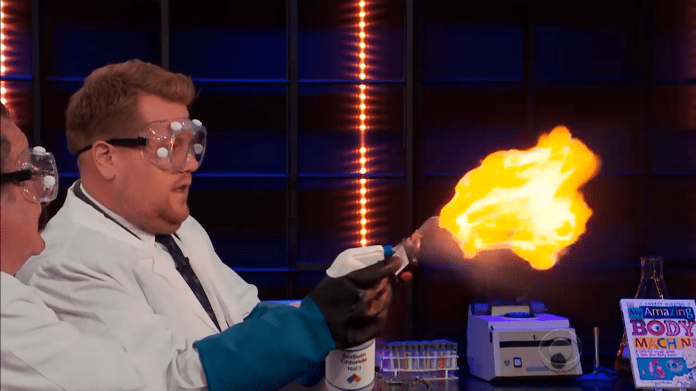 Profesor Winston telah menyediakan dua jenis gas di atas meja, yaitu nitrogen dan oksigen (dalam cairan H2O2). Beliau mengisi balon dengan gas hidrogen kemudian melepaskannya ke dalam air sabun melalui selang kecil hingga membentuk gelembung. Selanjutnya, ia mengambil sedikit buih lalu meminta rekannya – James Corden – untuk membakar gelembung tersebut dan yang terjadi adalah:
