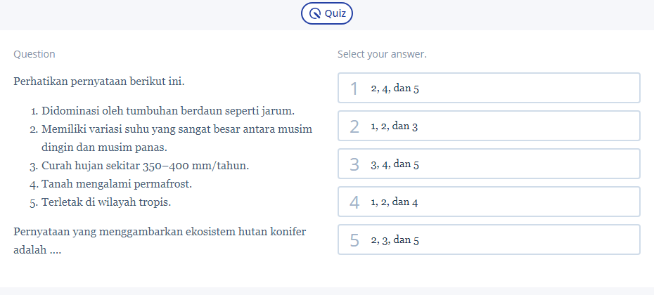 Dari sini, kamu mengetahui bahwa pernyataan yang menggambarkan ekosistem hutan konifer adalah pernyataan 1, 2, dan 3.