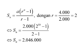 Pada kondisi tersebut, keuntungan setiap bulan merupakan kelipatan 2 dari bulan sebelumnya. Artinya, jika dibentuk barisan, keuntungan tersebut akan menjadi barisan geometri, yaitu Rp2.000, Rp4.000, Rp8.000, …,Un. Setelah 10 bulan, keuntungannya akan menjadi: