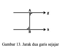 Jarak antara garis g dan h yang sejajar adalah garis AB, dengan titik A adalah sebarang titik pada garis g dan titik B merupakan proyeksi titik A pada garis h.