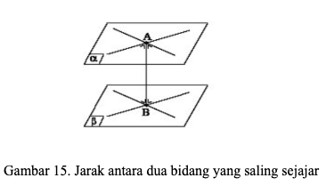 Bidang α sejajar dengan bidang β maka jarak kedua bidang = panjang ruas garis AB ( AB tegak lurus dengan kedua bidang).
