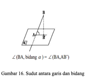 - Sudut antara garis dan bidang, sudut antara dua bidang.
