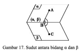 Sudut antara dua bidang (yang berpotongan) adalah sudut yang terbentuk oleh dua garis pada masing-masing bidang tadi di mana setiap garis itu tegak lurus pada garis potong kedua bidang tersebut di satu titik.