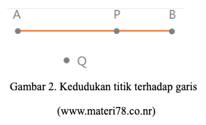 Titik berada pada garis karena garis itu melalui titik. Contohnya titik A, P, dan titik B pada gambar 2.