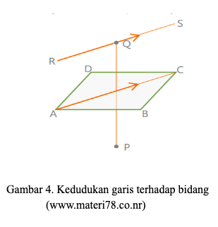 - Garis memotong atau menembus bidang yaitu contohnya garis PQ. Garis menembus/memotong bidang karena ada satu titik yang dilalui garis pada bidang itu (titik tembus).