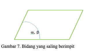 Dua bidang saling berimpit ( α, β). Apabila setiap titik yang terletak pada bidang α juga terletak pada bidang β atau setiap titik yang terletak pada bidang β juga terletak pada bidang α.