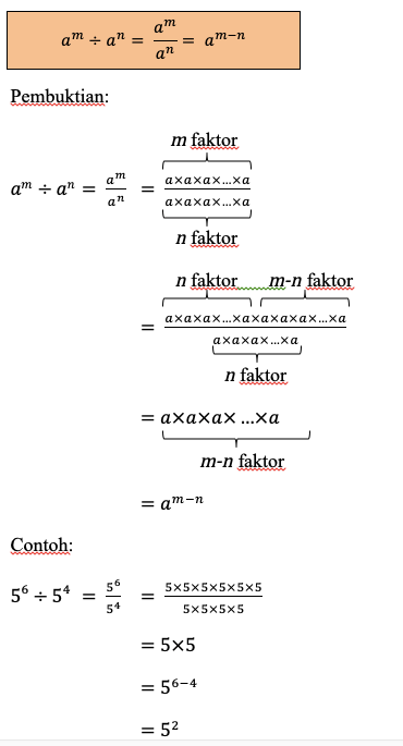 Kalau sifat pertama tadi berkaitan dengan operasi perkalian, sifat kedua ini berkaitan dengan operasi pembagian. Jadi, kalau kamu harus melakukan pembagian pada bilangan berpangkat dengan basis yang sama namun eksponen yang berbeda, kamu dapat langsung mengurangi eksponennya saja.