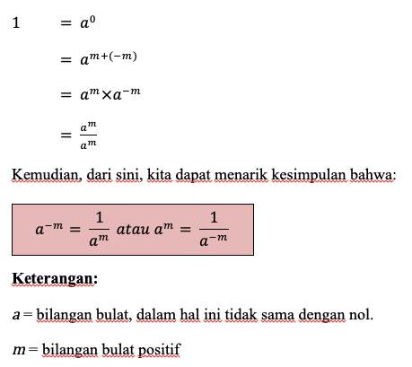 Tadi, kita telah berkenalan dengan bilangan berpangkat bulat positif beserta sifat-sifatnya dan juga bilangan berpangkat nol. Diketahui bahwa dan . Dengannya, kita bisa lho, mengetahui definisi dari bilangan berpangkat bulat negatif. Ini dia penjabarannya: