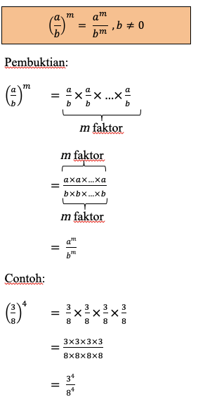 Perpangkatan terhadap pecahan bukan lagi hal yang sulit, deh! Berdasarkan sifat kelima ini, kamu bisa mempermudah operasi pemangkatan terhadap pecahan dengan memberikan eksponen yang sama pada pembilang dan juga penyebut dalam pecahan yang dipangkatkan tersebut.