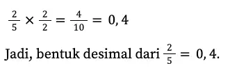 Untuk memudahkan, ubah 2/5 menjadi pecahan berpenyebut 10. Caranya adalah dengan mengalikan pembilang dan penyebutnya dengan angka 2.
