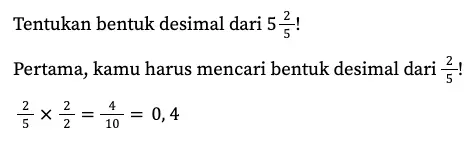 Mengapa disebut campuran? Karena hasil penyederhanaannya akan memuat dua jenis bilangan, yaitu bilangan bulat dan pecahan. Berikut ini cara mengubahnya menjadi pecahan murni, desimal, dan persen.
