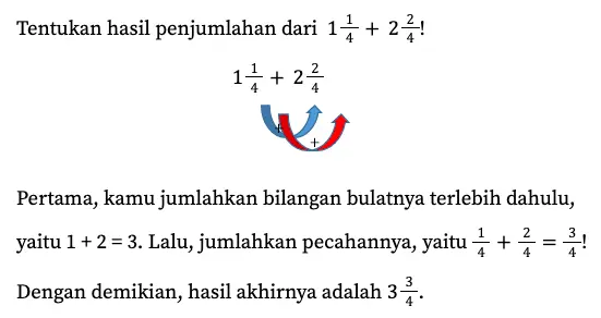 Jika dua atau lebih bilangan berpenyebut sama dijumlahkan, kamu bisa menjumlahkan bilangan bulat dengan bilangan bulat serta pecahan dengan pecahan. Perhatikan contoh berikut.