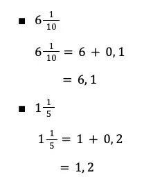 Desimal merupakan bentuk bilangan selain pecahan dan bilangan bulat. Biasanya, bilangan desimal ditandai dengan adanya koma di antara angka-angkanya. Contohnya 1,2; 3,4; 0,5; dan seterusnya. Cara mengubah pecahan campuran ke desimal adalah dengan menjumlahkan bilangan bulat di depan pecahan dengan bentuk desimal pecahan itu sendiri.