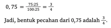 Pertama, kamu tentukan jumlah angka di belakang komanya. Pada 0,75 terdapat dua angka di belakang koma. Artinya, bentuk pecahannya berpenyebut 100. Dengan demikian: