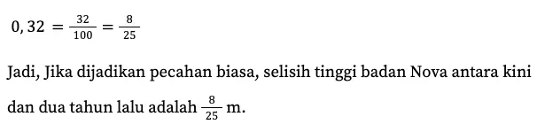 Dua tahun lalu, tinggi badan Nova 1,34 m. Kini, tinggi badannya menjadi 1,66 m. Jika dijadikan pecahan biasa, tentukan selisih tinggi badan Nova antara kini dan dua tahun lalu!
